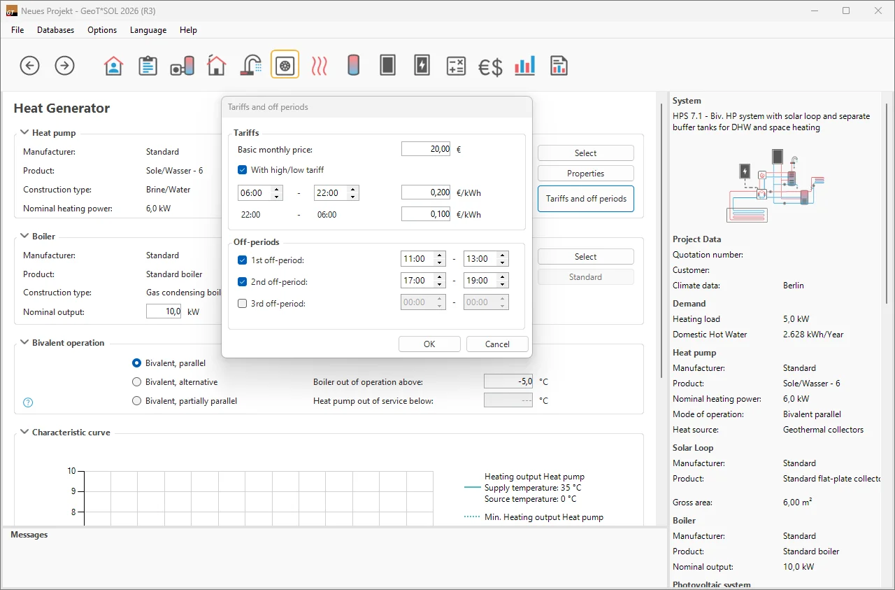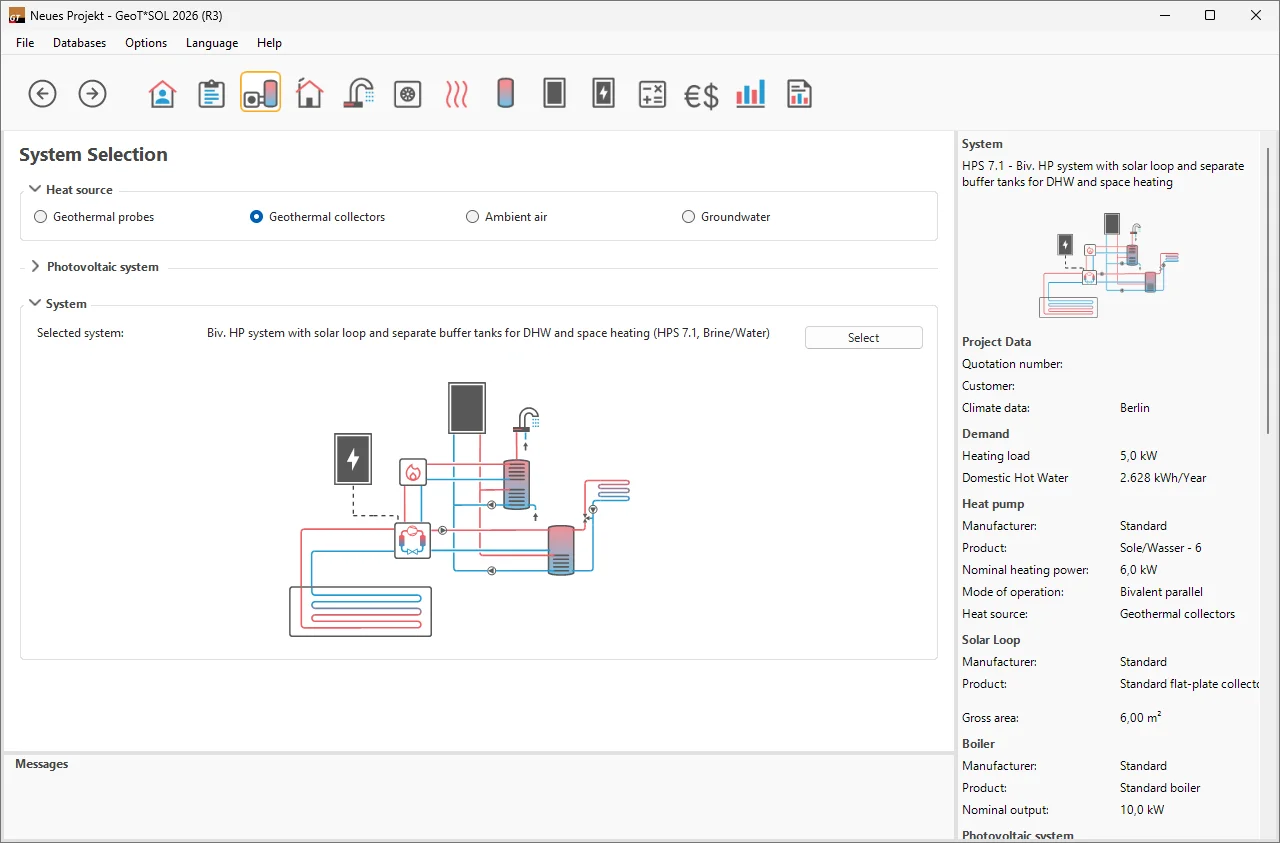 GeoT*SOL offers you the choice between different heat sources (soil, air and groundwater), operating modes (monovalent, monoenergetic and bivalent) and numerous system configurations for your location. The program allows for bivalent systems with boiler as heat generator as well as the integration of solar thermal systems and photovoltaic systems.