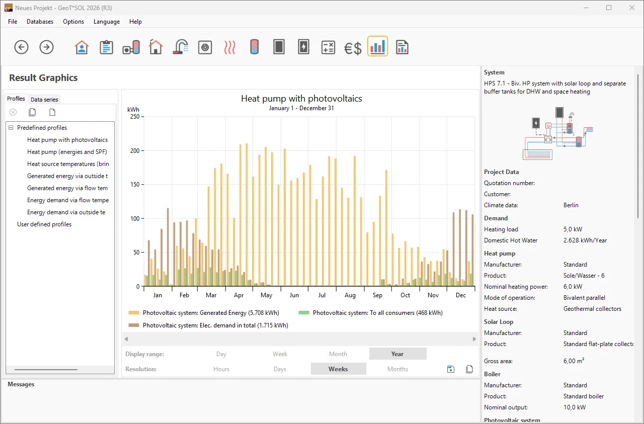 With GeoT*SOL you can simulate the heat pump system to the minute in order to determine seasonal performance factors (SPFs) and contribution margins. Monovalent, monoenergetic and bivalent modes of operation are available for selection. Other heat generators such as gas condensing boilers and solar thermal systems can be added. The integration of a photovoltaic system is also possible.