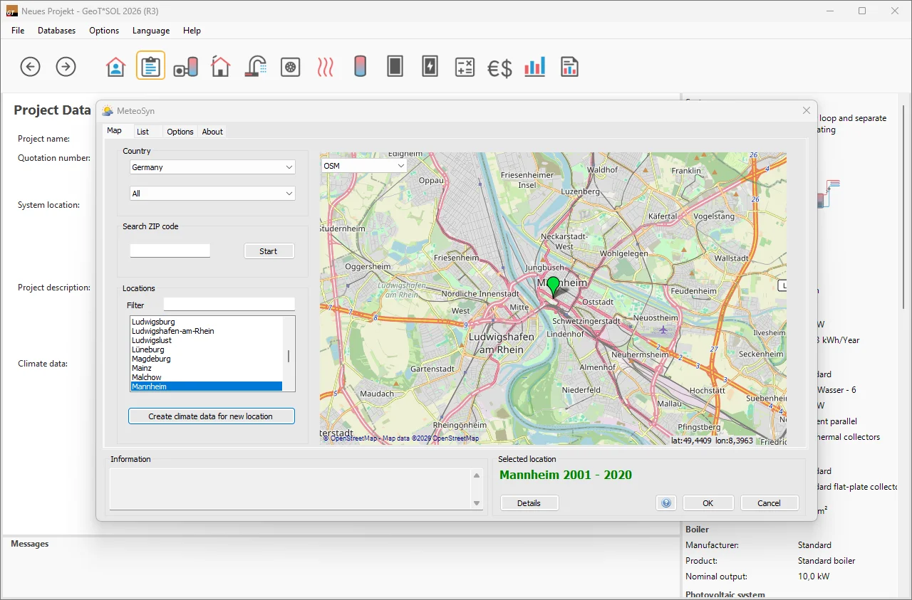 GeoT*SOL provides you with the latest TMY data of the DWD (current state 2017, averaging period 1995-2012) for Germany and more than 8,000 further climate locations for the whole world based on Meteonorm 9 (2001–2020). You can use the interactive map to conveniently select the climate data. Locations not included are interpolated using satellite data and neighboring ground measuring stations. The import of your own measurement data takes place via files in DWD, Meteonorm or WBV format.