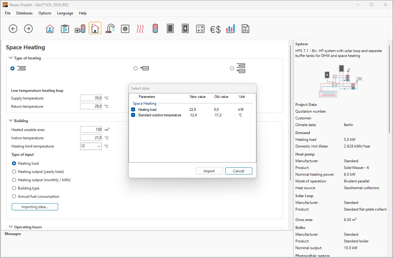 Since GeoT*SOL 2025 R7, you can import heating load data and other building information directly from the SOLAR-COMPUTER software portfolio. With this import feature, you benefit from the precise heating load calculations while avoiding duplicate work steps.