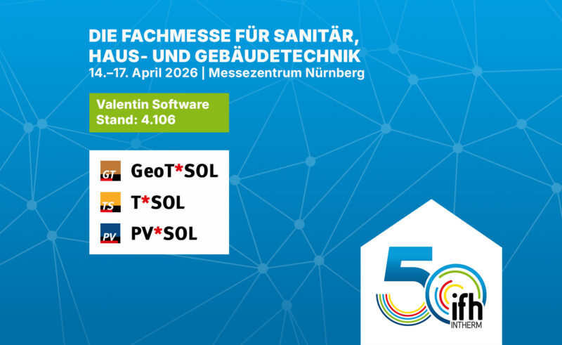 Unser Expertenteam steht an allen Messetagen für Produktberatungen und praxisnahe Einblicke in den Planungsprozess mit GeoT*SOL, T*SOL und PV*SOL premium zur Verfügung. Exklusiv zur IFH/Intherm bieten wir allen Messebesuchern einen attraktiven Rabatt auf unsere Jahreslizenzen.