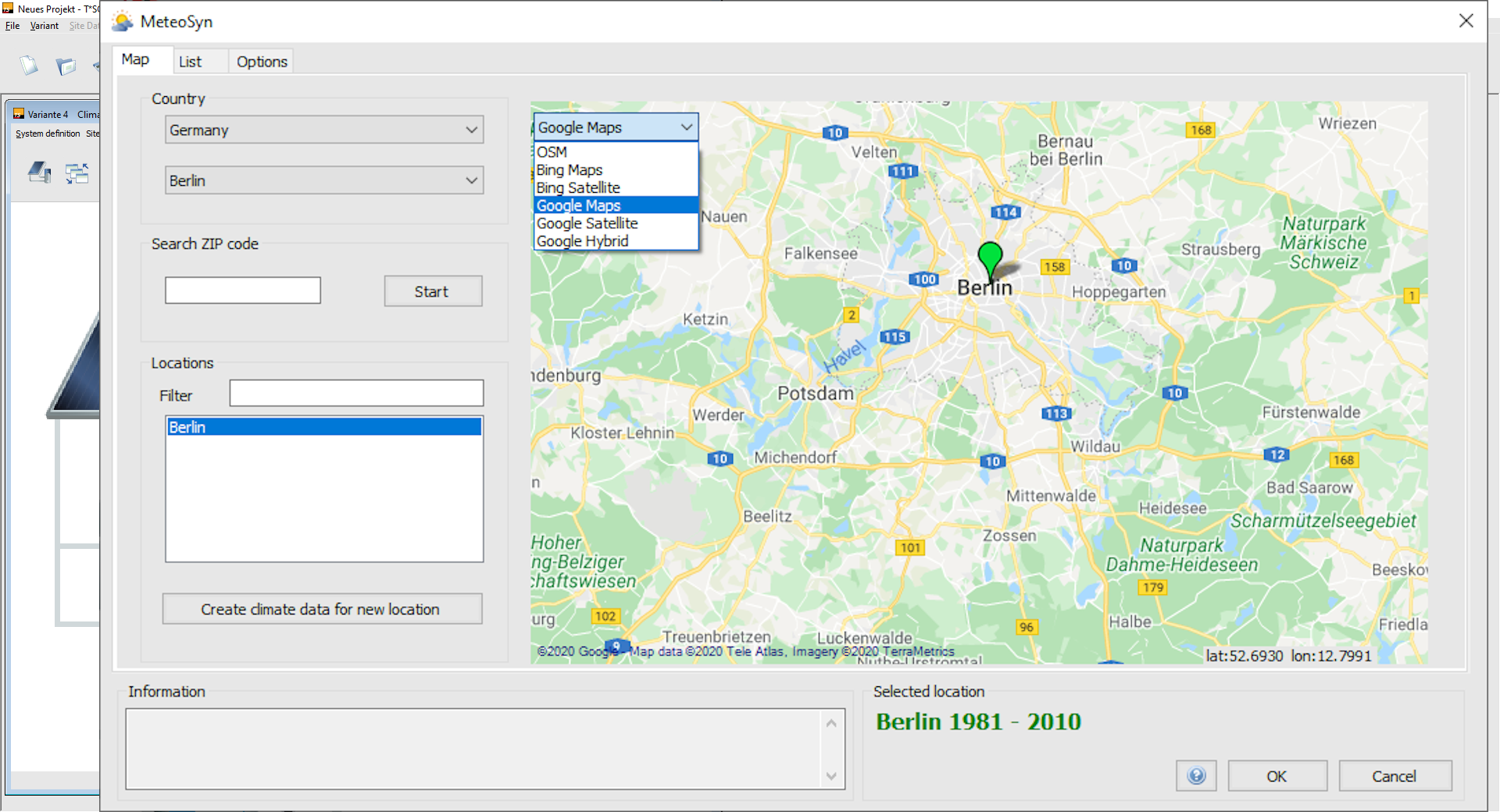 T*SOL provides you with high-quality TMY data sets for every km² in Germany (own procedure based on DWD data) and for any location worldwide with Meteonorm 8.2 (data period 2001-2020). You can use the interactive map to conveniently select the climate data. The import of your own measurement data takes place via files in DWD, Meteonorm or WBV format.