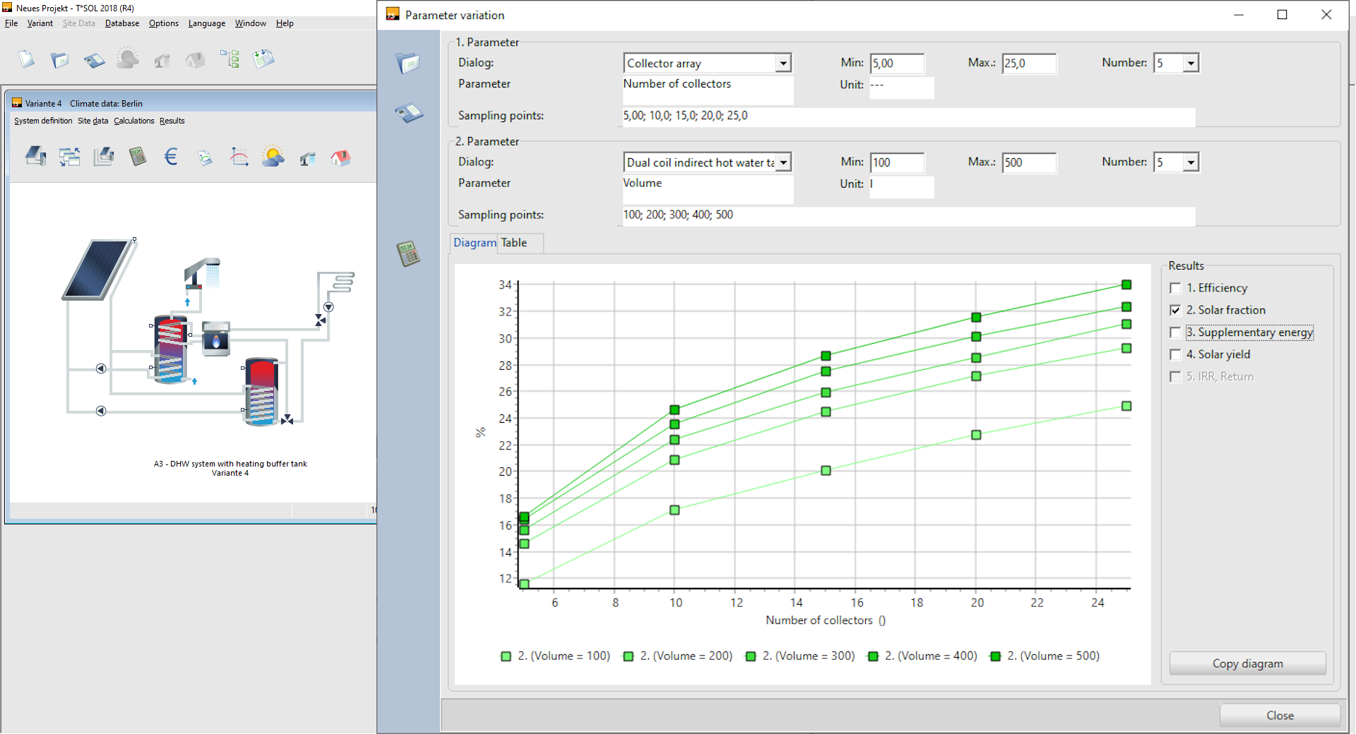 You can vary up to two parameters at the same time (e.g. collector area and storage volume) to find out the optimal values for the combination of target variables including "efficiency", "solar fraction", "additional energy" and "solar yield". </ p >